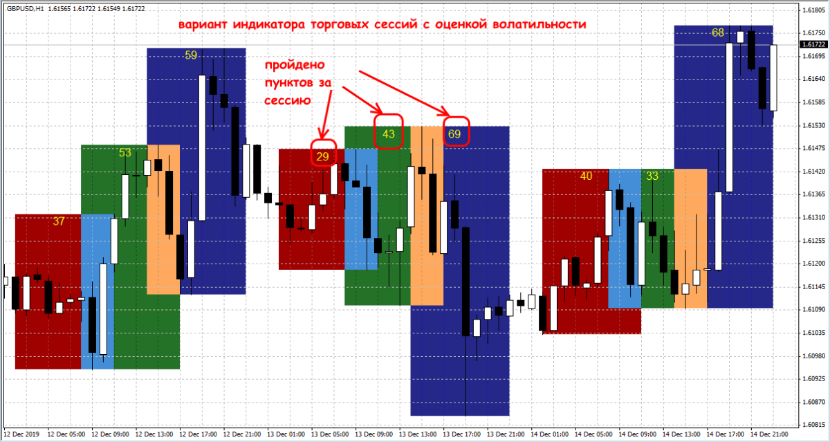 Есть индикаторы, которые не только выделяют цветом торговые часы, но и показывают дополнительную информацию, например, диапазон, который цена прошла за этот период:
