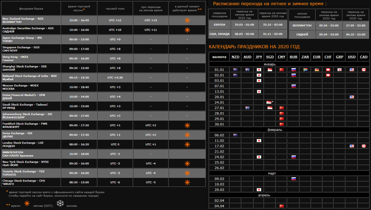 На каждый год определяется режим сезонного времени по регионам и тогда за счет разницы можно рассчитать режим работы бирж по текущему, привычному для всех времени GMT. Без сезонного перехода время UTC и GMT совпадает. Например, на момент написания статьи по московскому времени (летом и зимой) считается GMT+3.