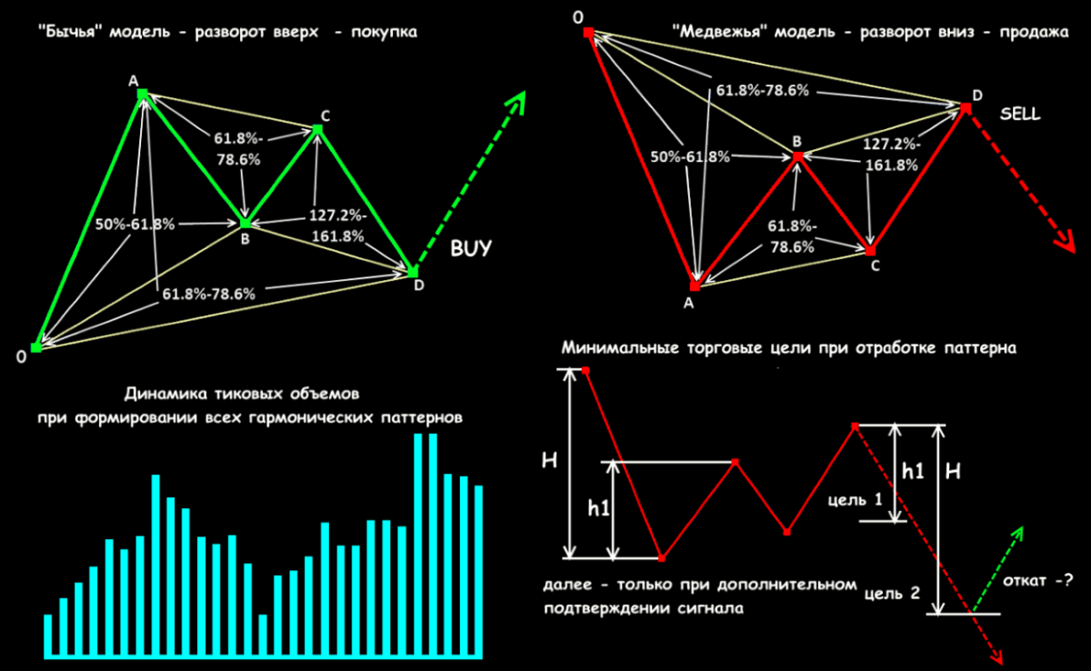 Каждая модель на старших периодах состоит из более мелких, внутри которых также соблюдаются гармонические зависимости, причем не обязательно аналогичные. Это удобно – пока отрабатывается глобальная фигура, внутри нее также можно торговать.