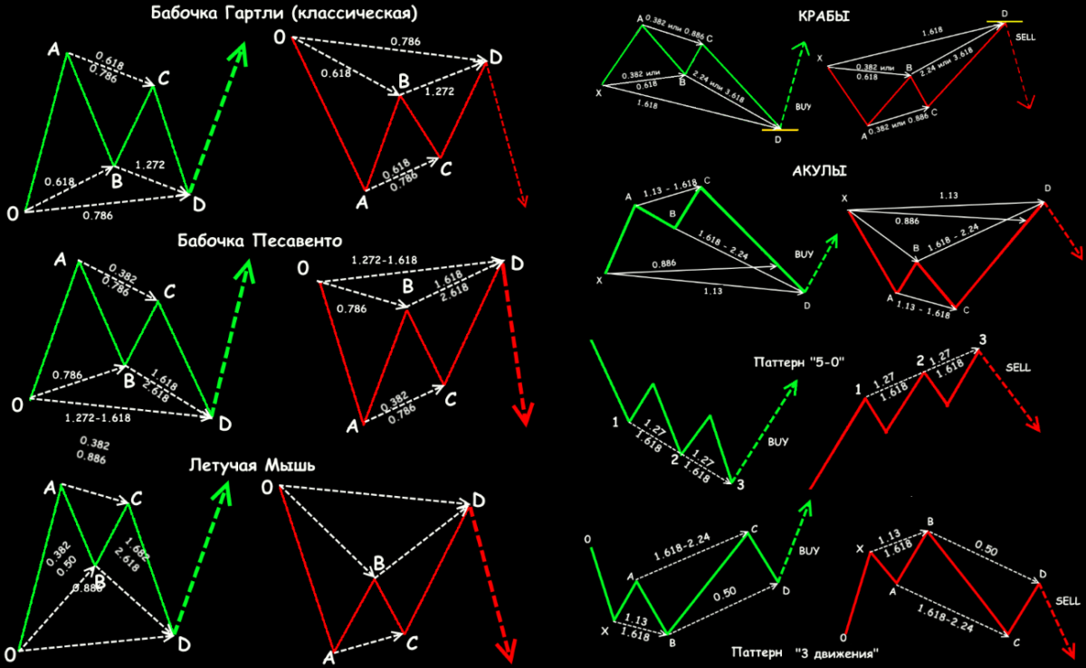 Ниже на схеме приведены самые популярные модели, которые чаще всего «находит» индикатор Zup. Математические зависимости внутри паттерна точно никогда не соблюдаются – идеальные модели появляются крайне редко.