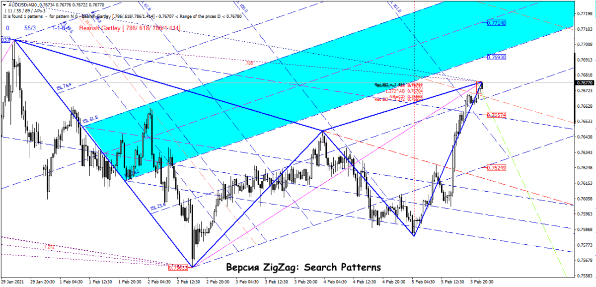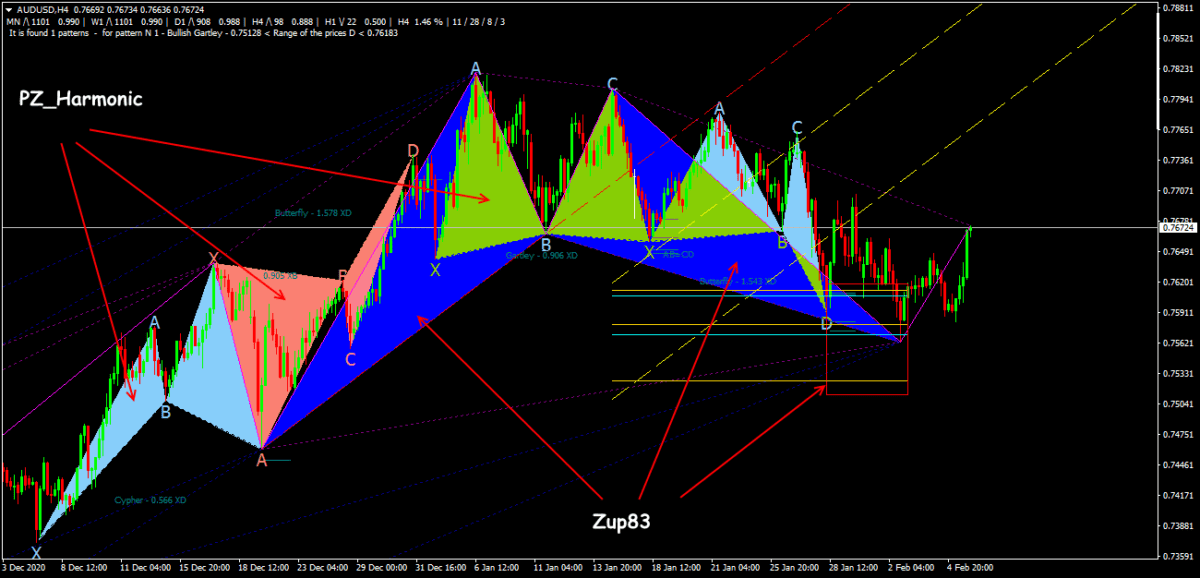 Название паттерна и его параметры отображается в левом верхнем углу рабочего экрана, особенно выгодны версии с алертом. Если обновится последний экстремум ZigZag, то анализ выполняется заново и базовые точки могут поменяться. Чаще всего виден только последний (неотработанный) паттерн, но есть и те, кто сохраняет историю. Расчет по разным версиям может существенно отличаться.
