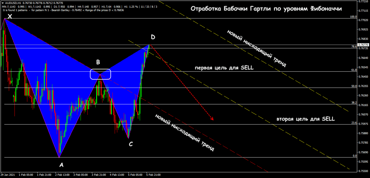 Дальше рассуждаем все просто: если фигура «летит» вверх, то ждем разворот вниз от верхнего экстремума. Если Бабочка сформировалась «крыльями» вниз, то планируем рост от нижней точки правого «крыла».