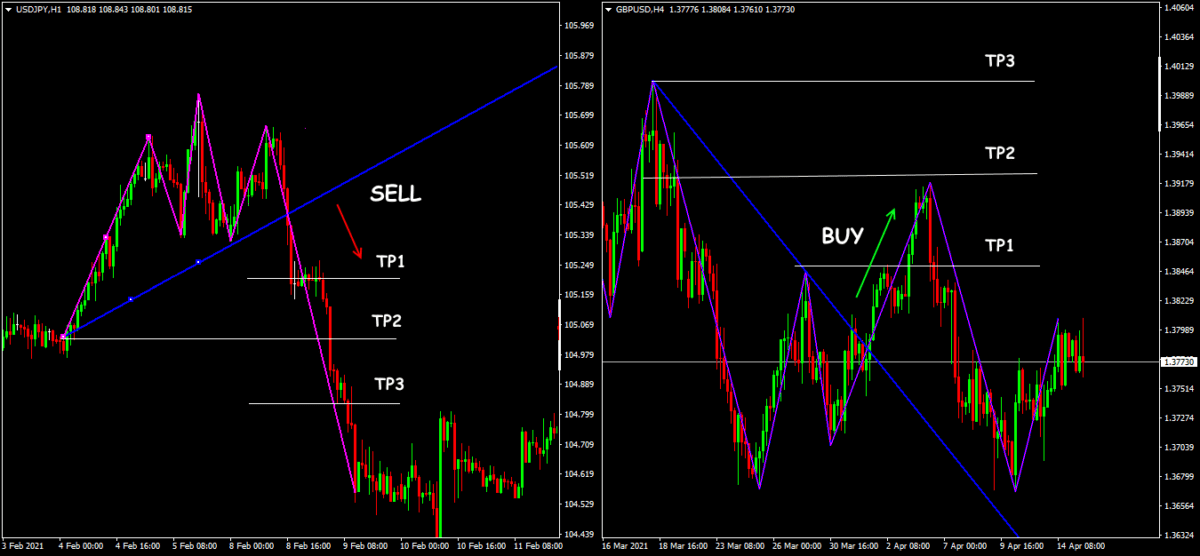 Собственно, Хвостом считают расстояние от открытия позиции точки до третьей цели – это и есть потенциальный профит от реализации паттерна. Модель считается выполненной при достижении уровня Головы, хотя на сильном тренде позиции и дальше можно держать открытыми.