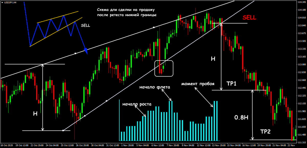 - вверх, то открываем SELL после пробоя линии поддержки (нижней границы);