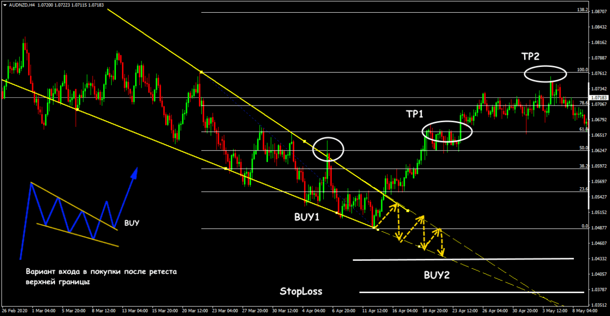 - вниз, то открываем покупку после пробоя линии сопротивления.