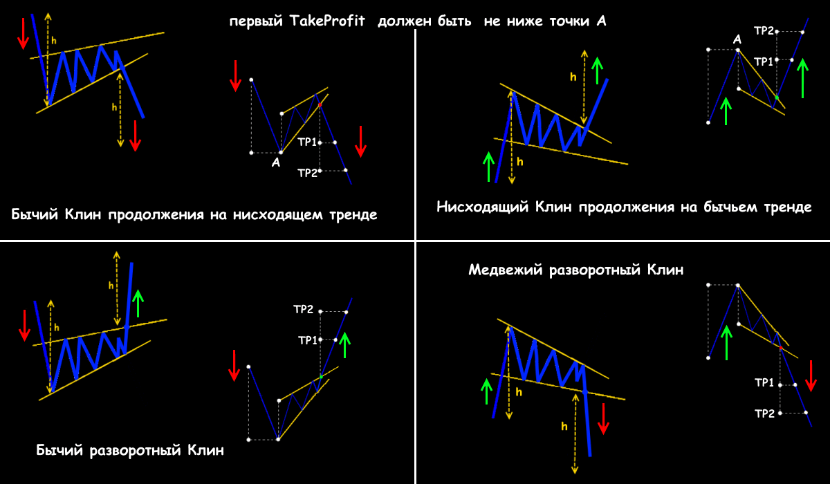 Теоретики графического анализа считают глобальной моделью именно Клин (Wedge), а популярные Флаг, Треугольник и Вымпел — его частными версиями. Клин считается фигурой двойного толкования. Простыми словами − после ее появления с равной вероятностью стоит ждать или продолжение, или разворот тренда. Схема отработки паттерна зависит только от фундаментальной ситуации на рынке и поведения спекулянтов перед пробоем границы.