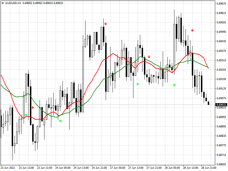 Предназначение стрелочного индикатора Arrow – указывать потенциальные сигналы на основе данных при пересечении нескольких скользящих средних. Это простой индикатор, а его принцип работы заключается в указании сигнала, при которых трейдер сможет входить в позиции при помощи элементарных действий. Сигналы поступают в виде стрелок на графике (рис.1).