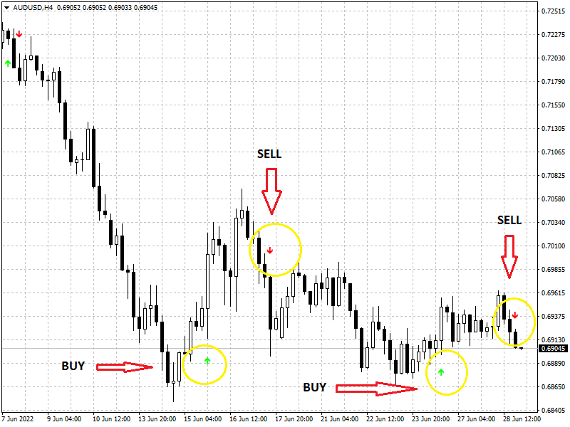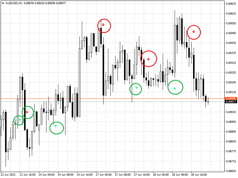 В работе Arrow нет ничего сложного, поэтому разобраться как им пользоваться разберётся даже новичок. Сигналы индикатора приходят в терминал с алертом и указывают направление последующего движения торгового инструмента. В этот момент на графике появляется зелёная стрелка вверх и означает сигнал на покупку и движение актива вверх. При появлении стрелки вниз – сигнал означает, что нужно продавать, он имеет красный цвет по изначальной инструкции к индикатору. Такой подход используют как для форекс, так и для бинарных опционов, различие только в интерфейсах рынков. На рис.2 сигналы на шортовую позицию обведены красным кругом, сигналы на лонговую сделку обведены зелёным. Это и будет будущая точка входа.