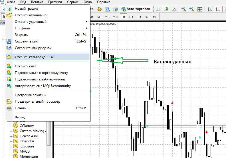 Перед тем как начать торговать с помощью этого индикатора и разобраться как с ним работать, необходимо его установить в терминал. В стандартной версии терминалов его нет. Для MT4 и для МТ5 можно найти индикатор в свободном доступе и скачать его. Так же этого помощник можно установить и для торговой платформы TradingView. Для терминала Quik нет информации о поддержке стрелочного индикатора Arrow. Установка простая. Скачанные три файла нужно просто скинуть в каталог данных как показано на рис.3, в папку MQL/Indicators. Далее перезагрузить терминал и перетащить индикатор в окно с графиком. Кликнув на индикатор в списке, появится его меню настройки и описание, там же находится формула просчетов индикатора, значение которых можно изменить