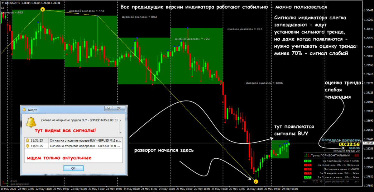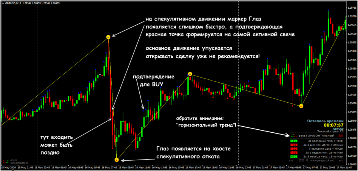 «Глаз» любой версии уверенно анализирует тренд только на среднесроке, а при движении в малом диапазоне доверие к его сигналам резко снижается. Если «Глаз» решил, что готовится разворот и даже большую желтую точку показал, но тренд продолжается, то он молча перемещает маркер дальше по тренду, а иногда и вообще убирает. Так что таймфреймы ниже М30 категорически противопоказаны.