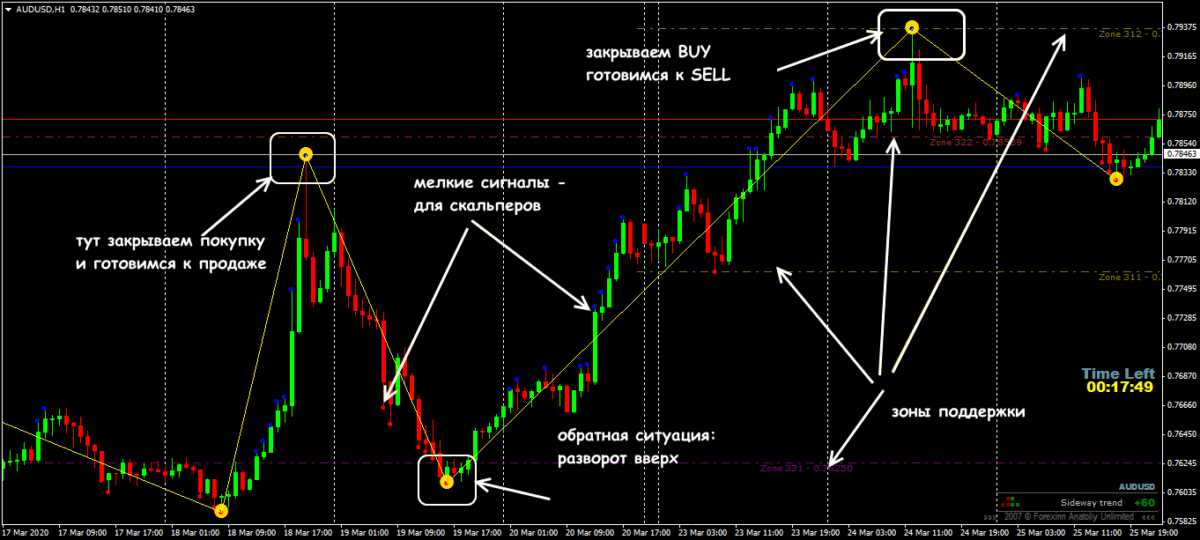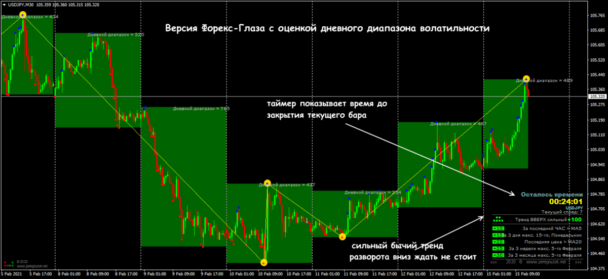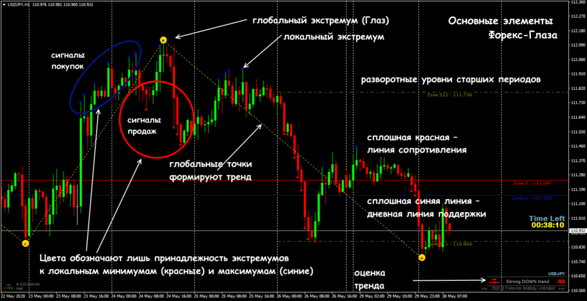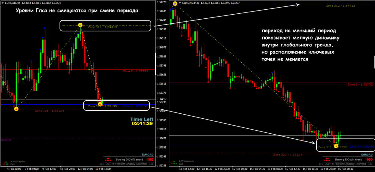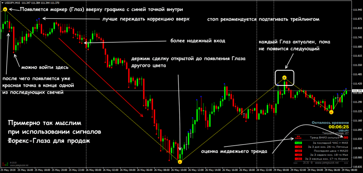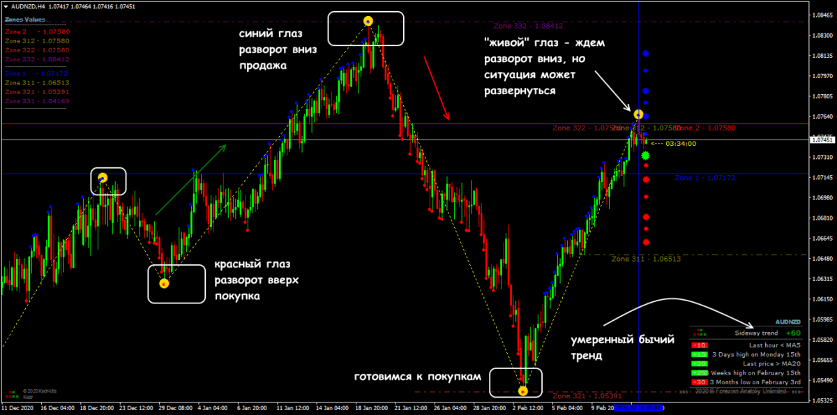 Всю эту инфу можно брать в работу, если после закрытия текущего бара общая ситуация с трендом не поменяется, но всегда есть риск полного пересчета параметров. До появления мелких точек после Глаза в рынок рекомендуется не входить.