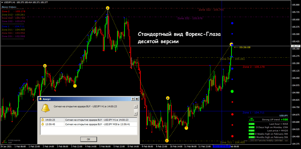 Когда-то предлагаемый индикатор активно продвигался как платное ПО и за счет агрессивной рекламы неплохо продавался форекс-блогерами, но сейчас все его версии можно бесплатно скачать из сети. «Глаз» считается прогнозным (гибридным) − совмещает комплексную оценку тренда c уровнями Pivot. Энтузиасты считают его последние версии полноценной торговой системой, которая и тренд нарисует, и разворот покажет, и ключевые уровни установит, и про точку входа сообщит. Этакое бесплатное счастье и для новичков, и для профи, но его сигналами нужно уметь пользоваться.