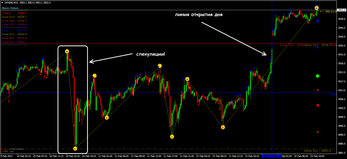 Ключевые зоны на всех таймфреймах строятся относительно прошлого дня – линию открытия дня можно вывести дополнительно.