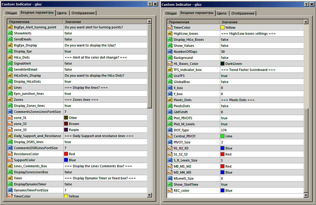 Расчетных параметров для корректировки пользователям в окне настройки не предлагается. То есть индикатор используется в режиме «as is» (как есть) − что прописано в алгоритме, тем и пользуемся, независимо от таймфрейма, актива, волатильности и прочих условий. Если формула расчета не вызывает у вас доверия, то и замечательный Форекс Глаз вам не нужен.