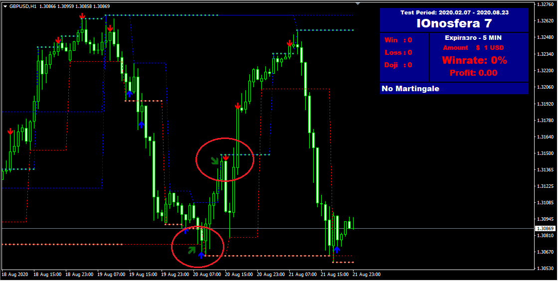 Точки входа представленный алгоритм ищет, опираясь на текущие важные уровни поддержки и сопротивления. Отскок от них открывает возможность для открытия сделки. Момент, когда можно заключить сделку «Call», помечается синей стрелкой вверх, а «Put» — красной, направленной вниз. Как видно на представленном ниже скриншоте, потенциальных точек входа индикатор Ionosfera дает очень много, но доверять каждой из них не следует. Единственный правильный способ, как пользоваться данным алгоритмом, — это полагаться на подтвержденные сигналы. На них указывает зеленая диагональная стрелка, появляющаяся немного левее от той, что указывает на направление открытия сделки. Принцип работы алгоритма подтверждающих сигналов не раскрывается.