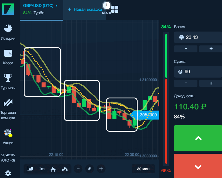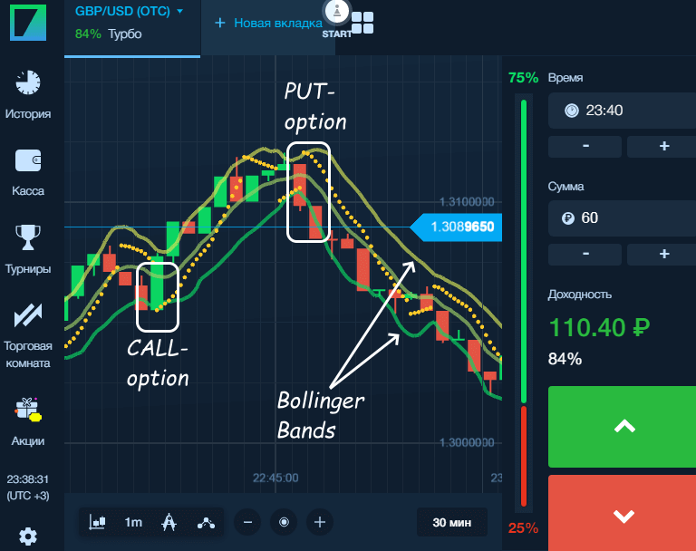 Стратегия предельно проста и доступна даже новичкам: CALL- опцион открываем, когда точки индикатора перемещаются под ценовой график, соответственно PUT-опцион, когда они выше цены.