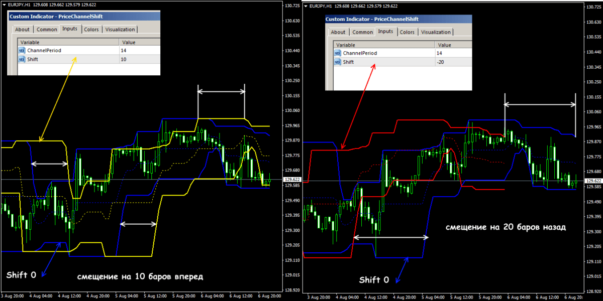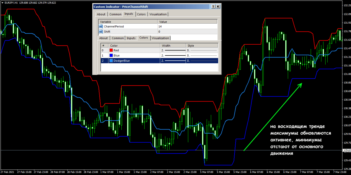 В зависимости от того насколько силен текущий тренд, максимальные и минимальные экстремумы обновляются с разной скоростью (например, max-мы опережают min-мы на восходящем рынке). В сети можно бесплатно скачать более сложные варианты, в том числе и для quikа, например, со смещением (параметр Shift) – «вперед в будущее» (положительное значение) или «назад в прошлое» (отрицательное). Это помогает уточнить точку пробоя границ канала.
