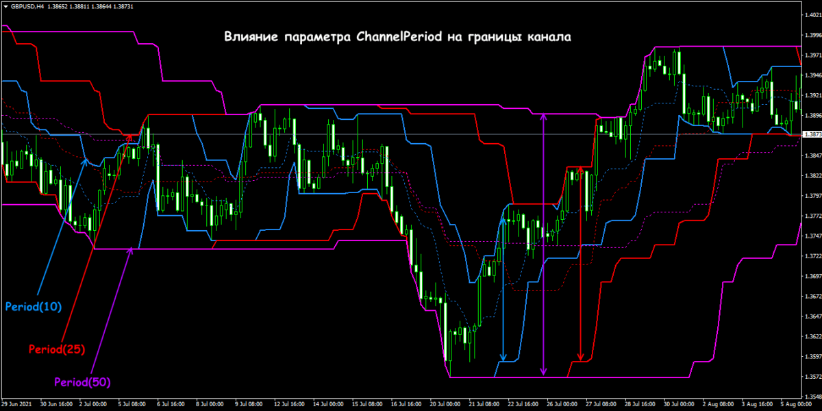 Слишком малый параметр сформирует узкий диапазон, который реагирует на все спекуляции − границы будут слишком «нервными». При увеличении параметра может получиться слишком широкий канал и большинство внутренних экстремумов будут пропущены.