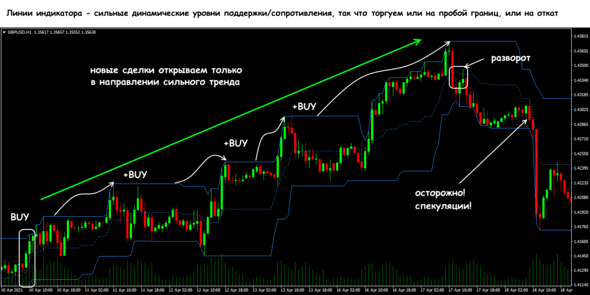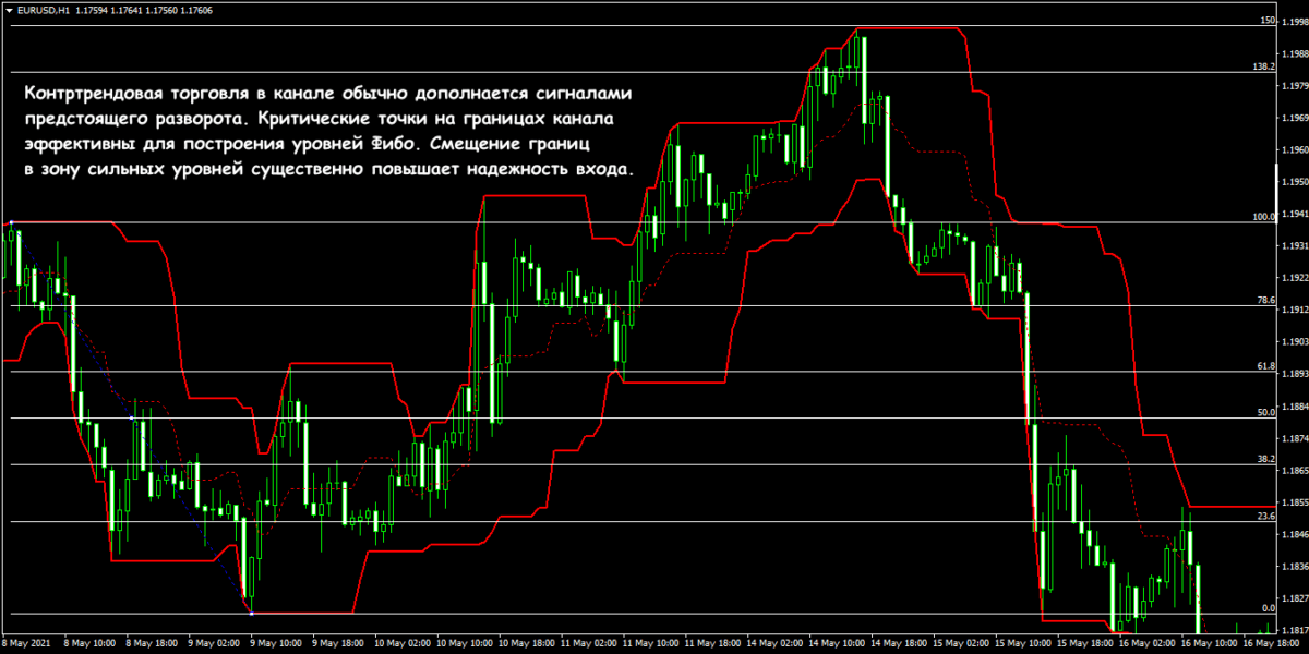Против тренда с индикатором ценового канала можно торговать только при наличии дополнительных сигналов разворота.