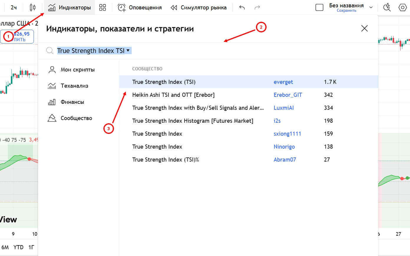 Вверху страницы кликните на кнопку “Индикаторы”, укажите “True Strength Index TSI” и выберите первый вариант от пользователя everget. Затем закройте окно, нажав на крестик.