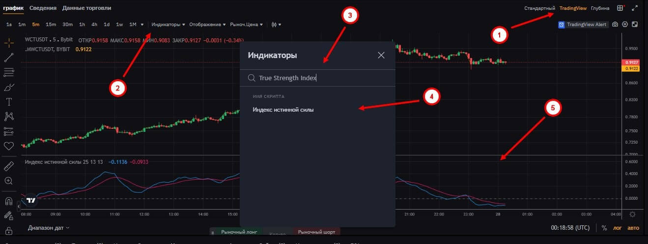 Затем перейдите в режим отображения графика “TradingView” и выберите раздел “индикаторы”, где нужно будет указать “True Strength Index”. В списке появится “Индекс истинной силы” – нажмите на неё и ниже графика появится инструмент, который позволит проанализировать информацию.