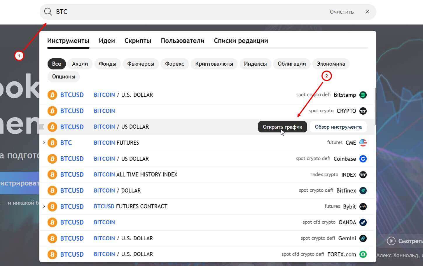 Первым делом перейдите на официальный сайт TradingView и выберите интересующий вас актив, например, Bitcoin/USD на бирже Бинанс (Спот). Наведите мышкой на нужный инструмент и нажмите на кнопку “Открыть график”.