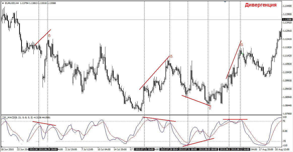 Если говорить про противоположный случай, то медвежья дивергенция возникает, в тот момент, когда цена достигает новых максимумов, но TSI не подтверждает это движение и формирует понижающиеся пики. Подобного рода расхождение между ценовым действием и поведением инструмента может служить сигналом для рассмотрения продажи актива.