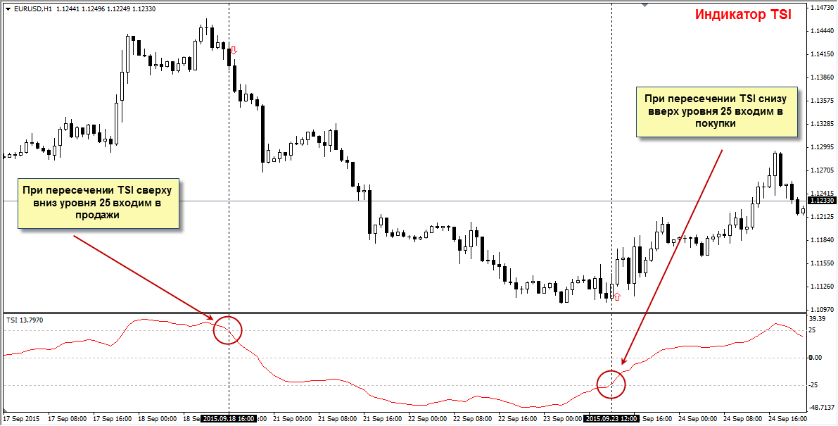 Наблюдая за тем, как TSI взаимодействует со MA, можно распознать торговые сигналы. Когда индикатор пробивает линию MA в направлении сверху вниз, формируется медвежий сигнал, что может служить основанием для размышления о продаже актива. С другой стороны, пересечение индикатором ТСИ скользящей средней в ином направлении – снизу-вверх – генерирует бычий сигнал, открывающий возможность для входа в позицию на покупку.