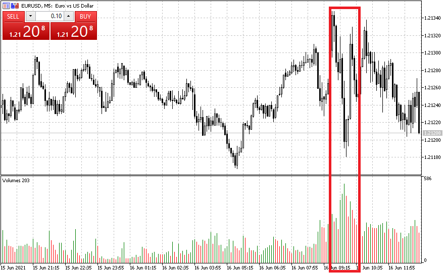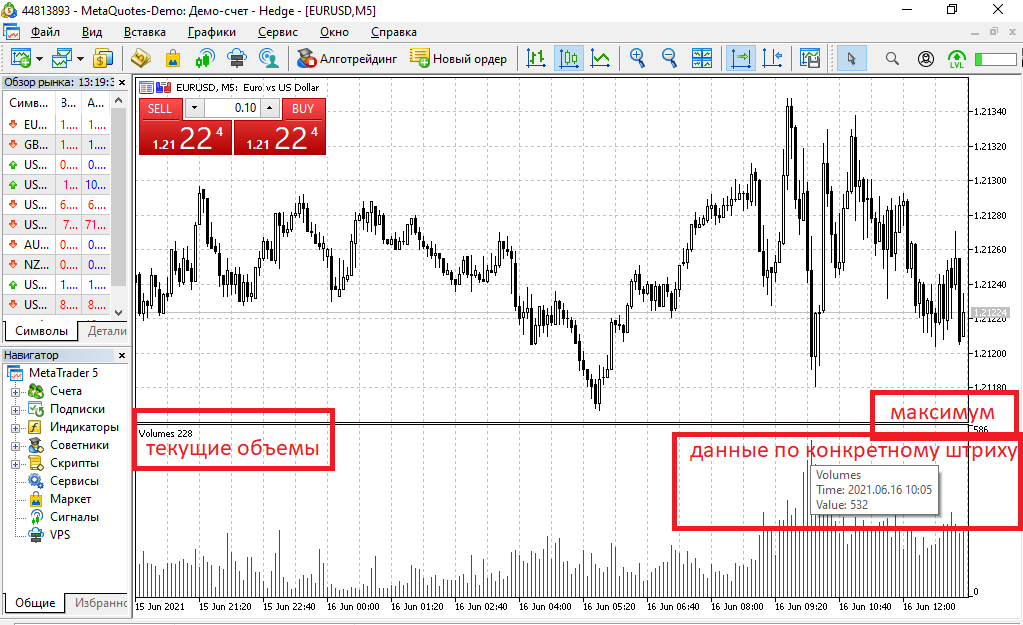 Рассматривая конкретные примеры, возьмем реальные котировки по евродоллару на пятиминутном графике. Индикатор вертикальных объемов Volumes, который подробнее рассмотрим далее, в виде отдельного окна отображает вертикальными столбцами информацию о количестве произведенных сделок в каждый момент времени. Наибольшего всплеска диаграмма достигает, когда происходит сильное движение вниз (отмечено на графике), когда всего за 15 минут удается заработать в максимуме 167 пунктов прибыли.