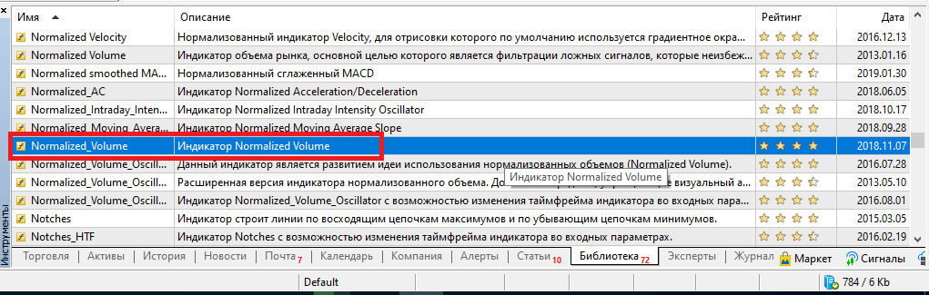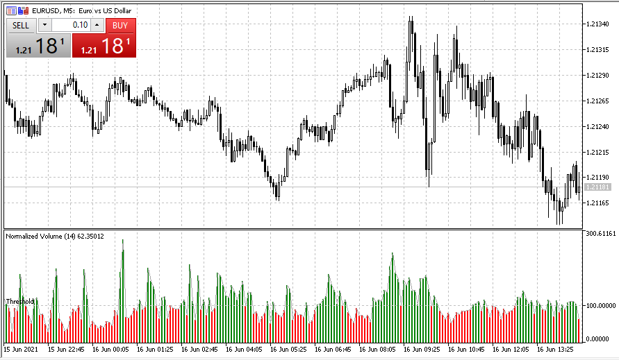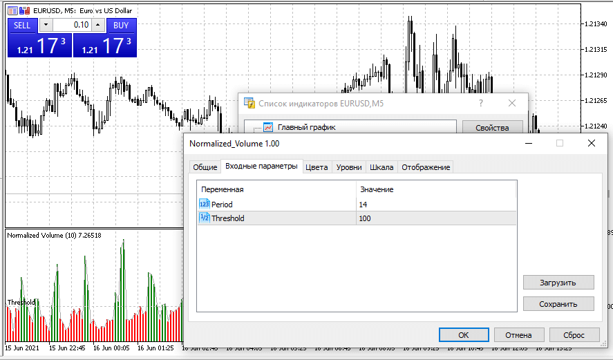 После установки под окном с ценовым графиком появляется гистограмма в виде знакомых по Volumes вертикальных штрихов. Основная задача – определение силы тренда. При расчете происходит нормализация текущих значений к среднему показателю за прошлый период. Таким образом, гистограмма получается более сглаженной, информативной и удобной в анализе.