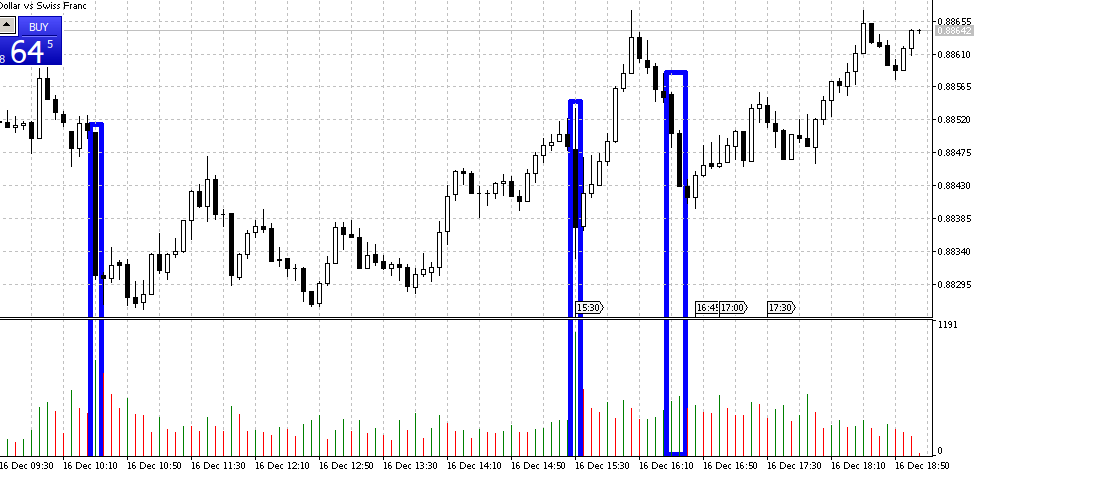 On balance volume индикатор, проще говоря, Volume — самый удачный актив для новичков. Он позволяет в удобном графическом виде получать информацию о текущих рыночных объемах. Ниже он изображен для MT4. Доступен и для Quik, еще одной популярной торговой программы. Отображение этого инструмента дано со стандартными настройками на пятиминутке USD/CHF.