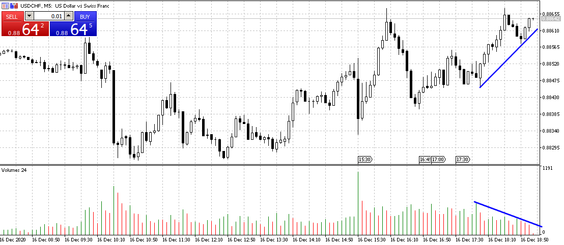 На рисунке ниже показана ярко выраженная дивергенция, когда рост котировок некоторое время не подтверждается соответствующим увеличением числа торговых операций. Это однозначно характеризует тренд как слабый или ослабевающий, стратегия торговли в таком случае предполагает закрытие имеющихся позиций и поиск лучших возможностей для входа, возможна работа с алертом для сигнализирования фондовому игроку о наступлении ожидаемых им условий для входа в рынок. Либо удержание, но с выставлением жестких стоп-лоссов по предыдущим свечам. В таком случае при появившихся предпосылках к развороту удастся сохранить полученный ранее профит.