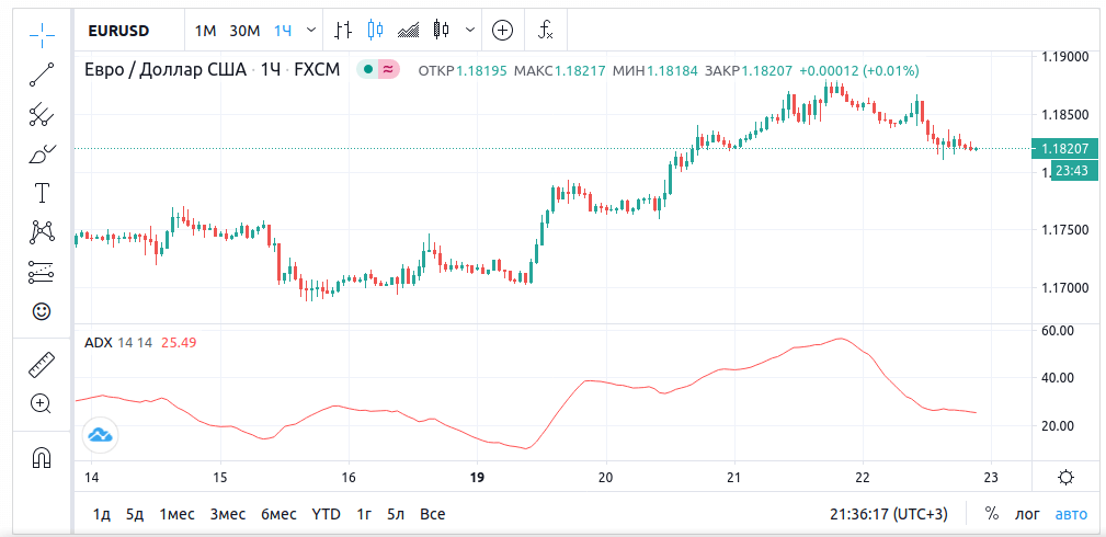 Завершает обзор еще один мощный осциллятор, показывающий силу тренда в каждый конкретный момент. Удобен как в самостоятельном применении, так и для работы по определенной стратегии с другими активами.