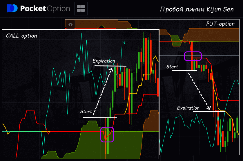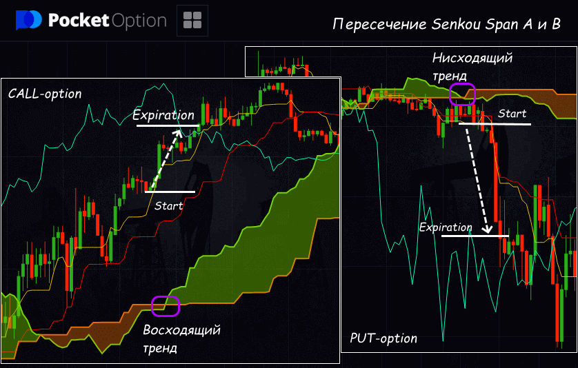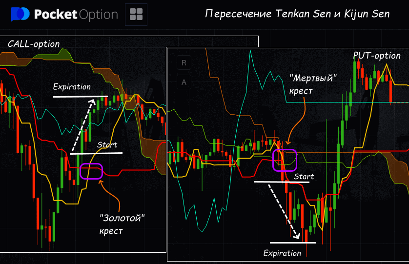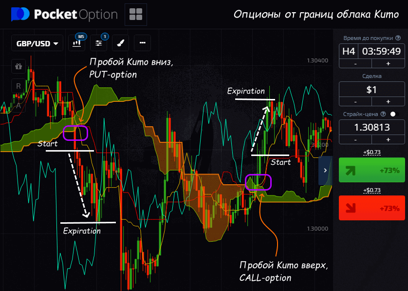 Опционы открываются по тренду (развороты и пересечения линий) и в канале Kumo (пробой или отскок от границ):