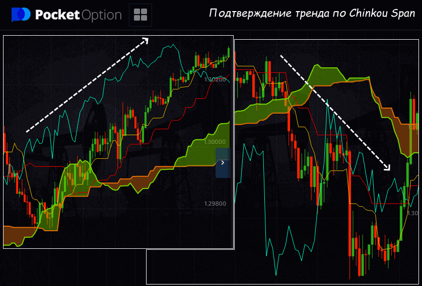 - Chinkou Span. Третья опережающая линия, показывает общую ценовую динамику и направление.