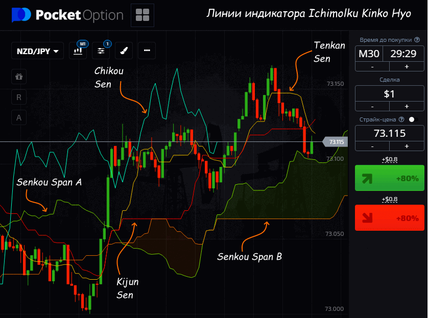 Между линиями SenkouSpan A – B находится «облако Ишимоку (Kumo)», обычно выделяемое на графике штриховкой. Когда ценовой график движется в этой области, это означает временную консолидацию, пробой/отскок от границ дает окончательное подтверждение другим сигналам.