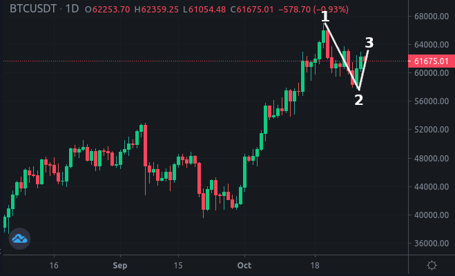 Фиксируем начавшееся контрдвижение в точке 1, определяем ширину канала между 1 и 2 в $9167, занявшее 10 баров (с поправкой на дневной таймфрейм имеем ожидаемый период нового тренда в эти же 10 дней). В моменте написания статьи тренд достиг уровня в $61675, ближайшее сильное сопротивление — на уровне $64000, либо по максимумам предыдущих свечей — $63125. Итого максимальный риск составляет $875 при большей в десять раз прибыли.