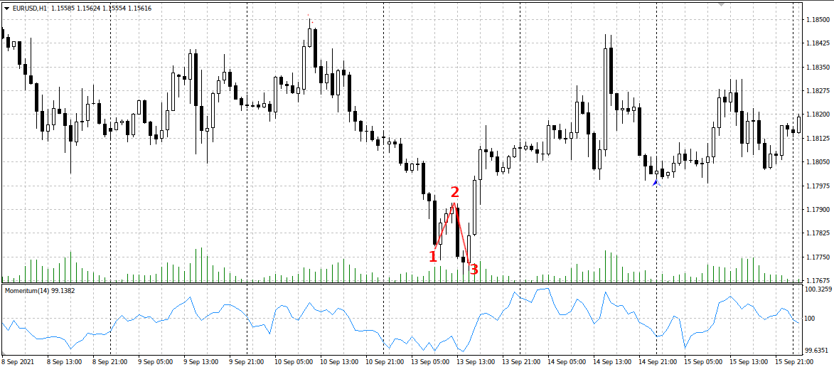 Первопричиной формирования модели является остановка цен после продолжающегося снижения (в рассматриваемой ситуации, для замедления растущего графика ситуация будет выглядеть зеркально). Прекратив движение в моменте 1, котировки начинают двигаться контртрендово. Это является причиной ликвидации позиций крупными игроками (либо большим количество частных трейдеров), благодаря чему на рынке возникает большое количество позиций на покупку. Достигнув вершины коррекции в точке 2, снижение возобновляется, но достигнув предыдущего минимума, отталкивается в точке 3 и берет старт очередной вектор. В рассматриваемой ситуации важно учитывать несколько важных нюансов: