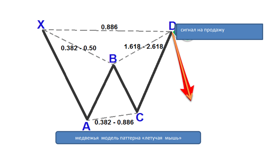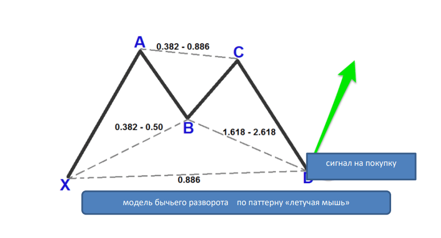 Суть модели сводится к тому, что цена актива по окончании тренда разворачивается не одномоментно, а путем некоторого зигзагообразного движения в различных направлениях, где точками разворота служат уровни Фибоначчи (т.е. на уровнях и пропорциях «золотого сечения»). Фактически графический паттерн «летучая мышь» является разворотным индикатором, который служит достоверным сигналом о том, что происходит смена текущего тренда.