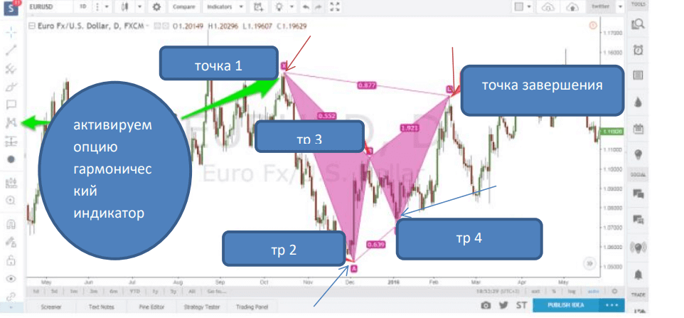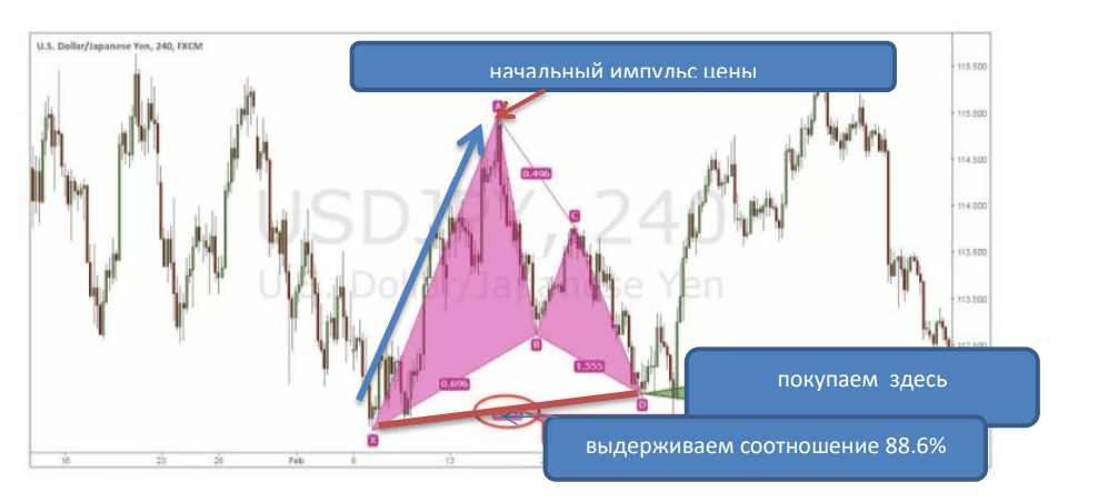 Еще эту графическую модель разворота (смены) тренда называют гармонической моделью, так как она соответствует строгим математическим критериям и пропорциям уровней Фибоначчи.