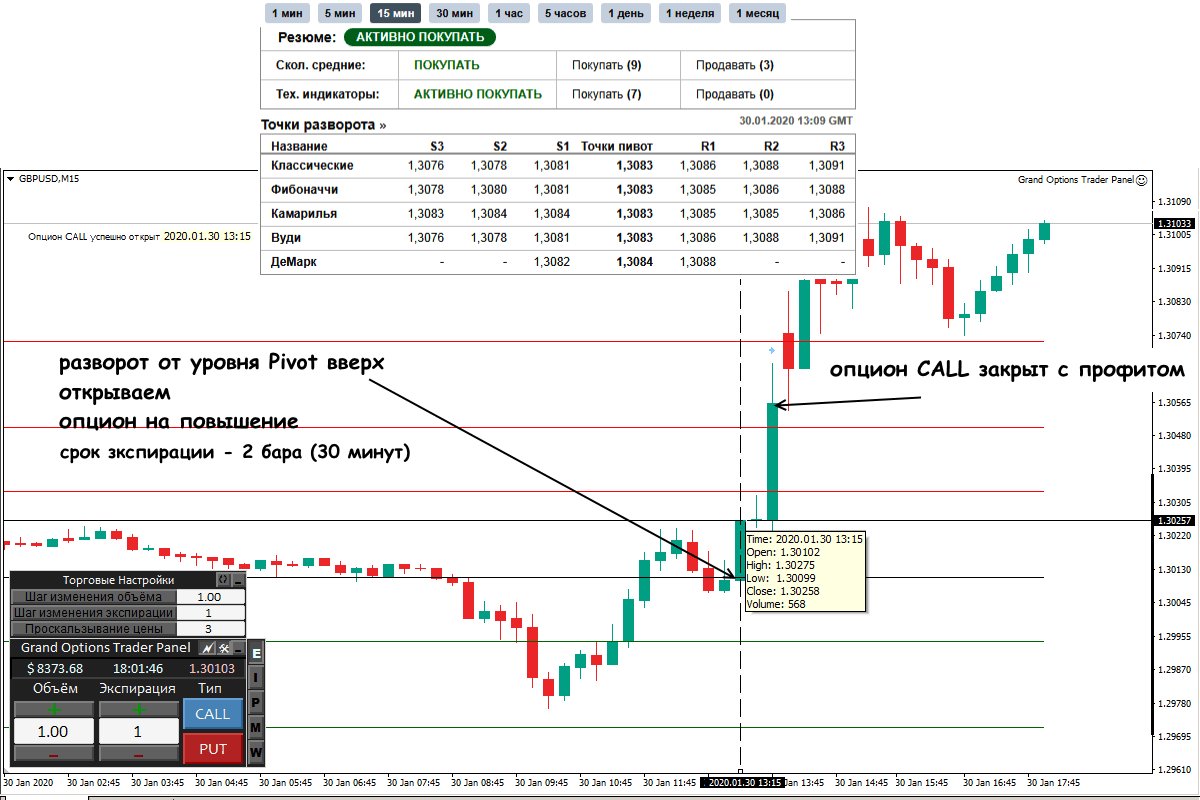 Попробуем опцион GBP/USD на периоде М15. Ждем откат от уровня PP с подтверждением (по свечным моделям), дополнительно проверяем расчет Пивот на внешнем ресурсе. Примерно так: