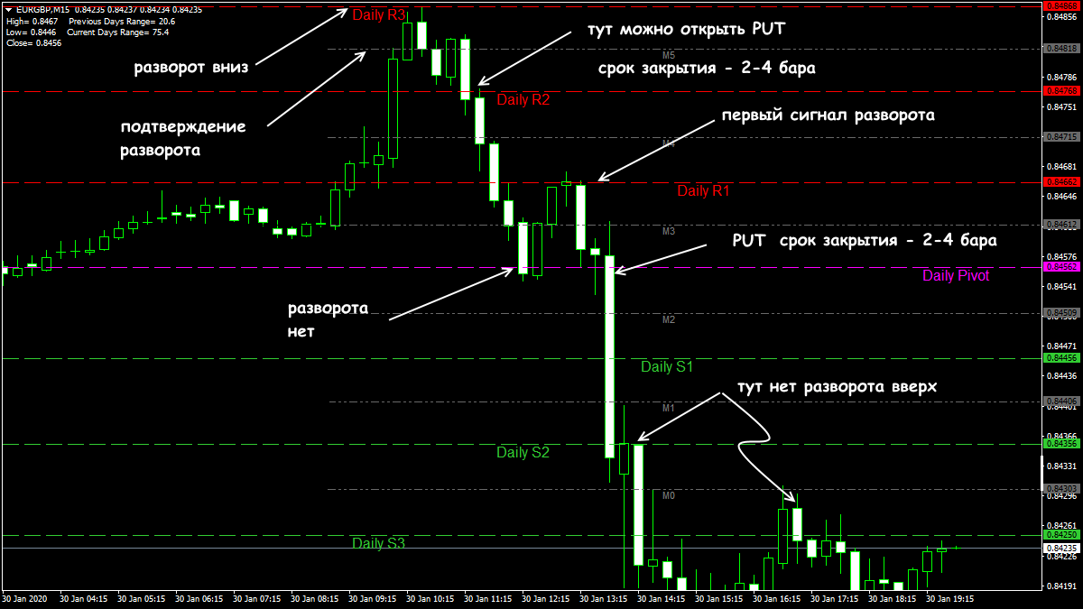 Дополнительные сигналы можно получить от промежуточных уровней S0.5; S1.5; S2.5; R0.5; R1.5; R2.5, что особенно важно для бинарной торговли.