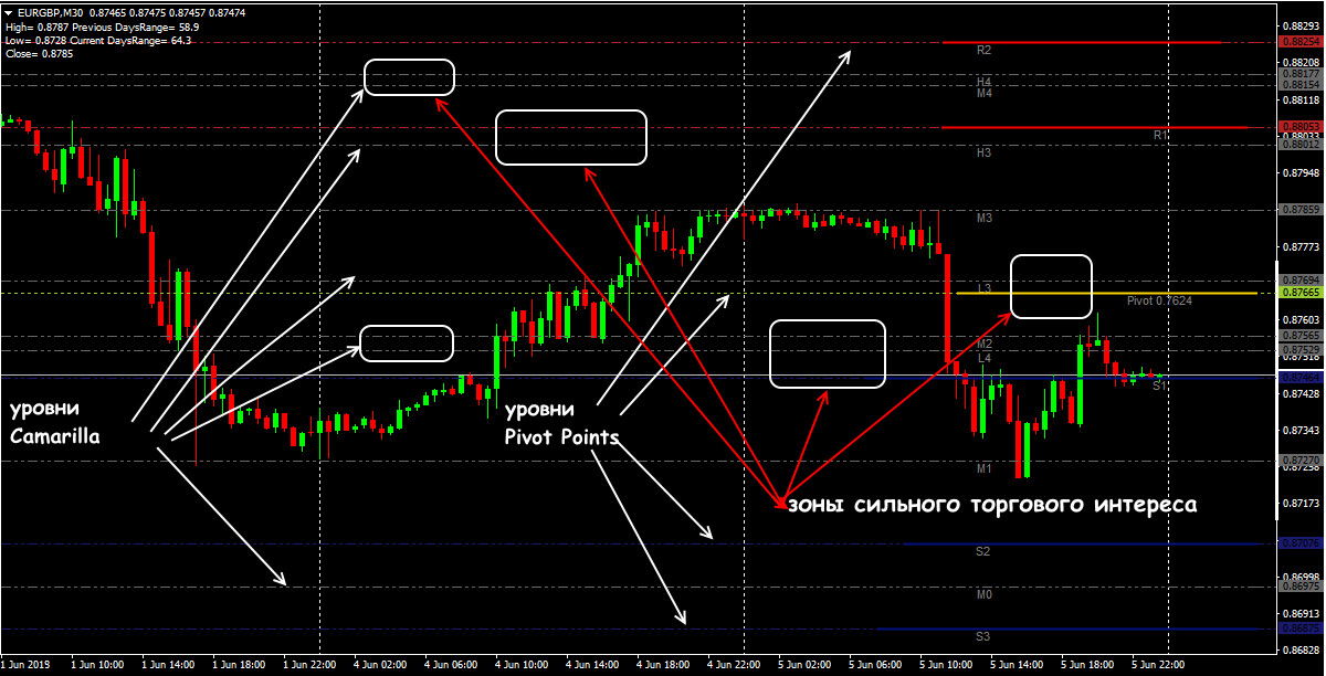Если несколько уровней располагаются примерно рядом, торговое значение этой зоны значительно усиливается. Если цена зависает в диапазоне R1-PP-S1, то сигналы по данной схеме игнорируем.
