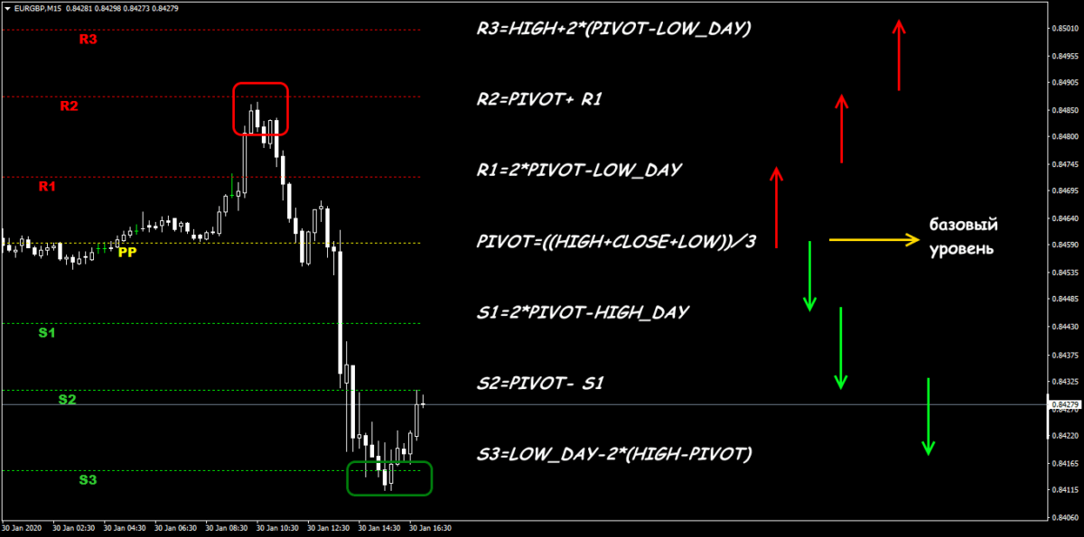 Сначала рассчитывается ключевой уровень PP (в центре) как среднеарифметическое из трех основных цен – max, min и цены закрытия (см. на схеме ниже).