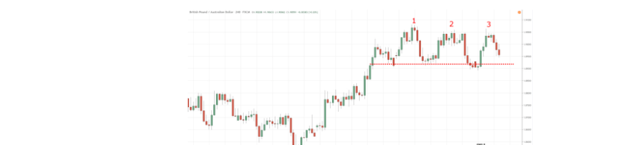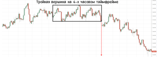 Точность индикатора «тройная вершина» зависит во многом от используемого таймфрейма или временного периода анализа. Для объяснения этой ситуации рассмотрим формацию «тройная вершина» на небольшом (малом) тайминге – например, на 4 — часовом.