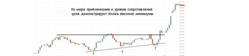 Это является сигналом о том, что цена актива будет повышаться. В данном случае следует рассматривать эту формацию не как «медвежий» паттерн, а как «бычий треугольник» или «восходящий клин». Это почти с 90% вероятностью сигнал о росте цены актива.