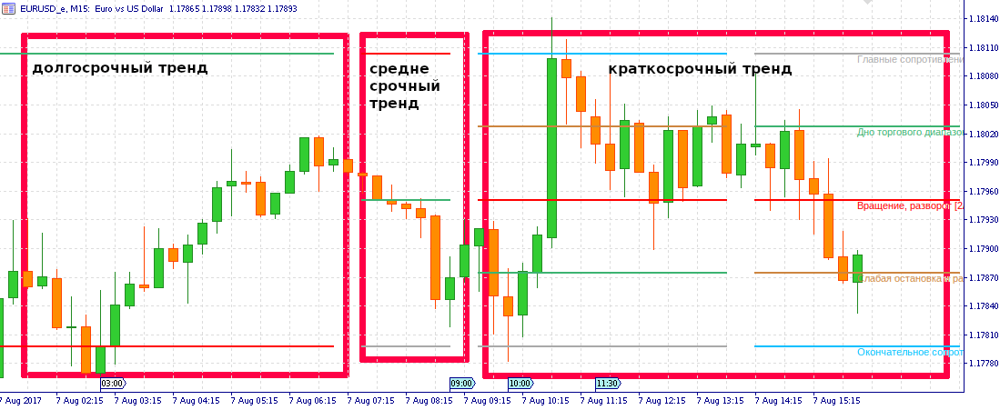 Благодаря тонким настройкам можно добиться отображения для разных периодов тенденции. На скриншоте ниже можно увидеть несколько видов для кратко-, средне- и долгосрочных тенденций в пределах одного окна. Поэтому даже в самом большом приближении игрок останется в курсе текущего развития тенденции в большей временной перспективе.