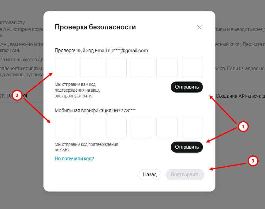- Пройдите проверку, запросив и указав проверочный код (к ним может быть код по смс, адресу электронной почты и двухфакторной аутентификации (2FA) от Google). После того как все коды были указаны нажмите на кнопку “Подтвердить”.
