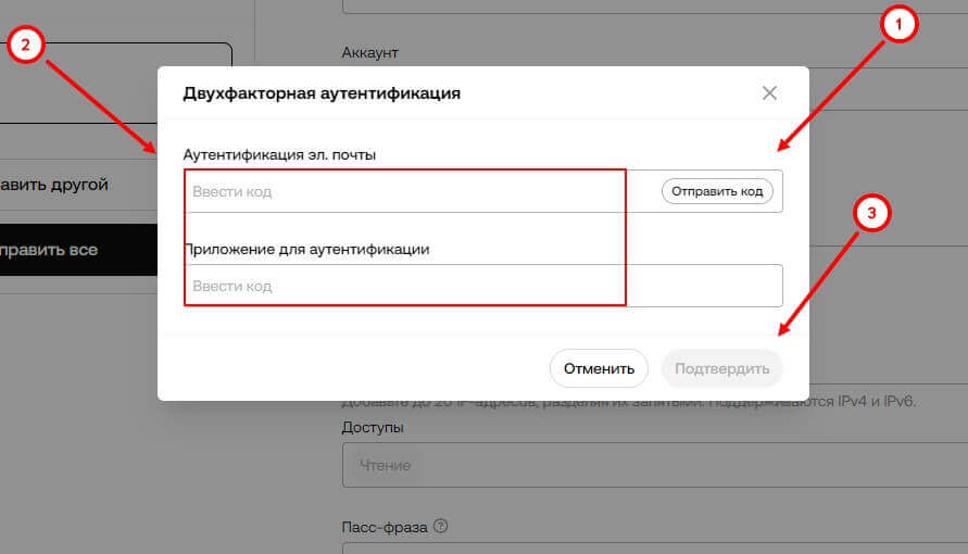 - Подтвердите создание с помощью кодов аутентификации. В нашем случае код из электронной почты и приложения 2FA. Для запроса кода на почту или телефон, нужно кликнуть на кнопку “Отправить код”. При подтверждении приложением 2FA нужно просто указать код. После ввода нажмите на “Подтвердить”.