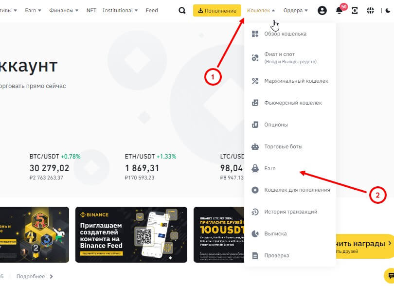 - Необходимо выбрать раздел “Кошелек”и нажать на кнопку “Earn”;